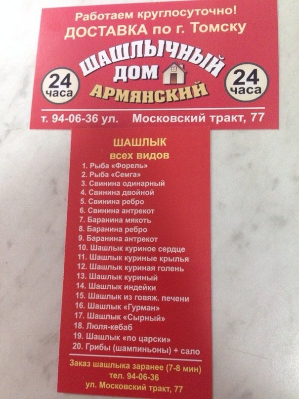 как оказывается шашлик можно еще и доставлять на дом(напр.как пицу). У нас в городе видел несколько таких обьявлений на столбах и пару раз даже в салонах маршрутных такси.Минимальный заказ-1кг. Вот так))