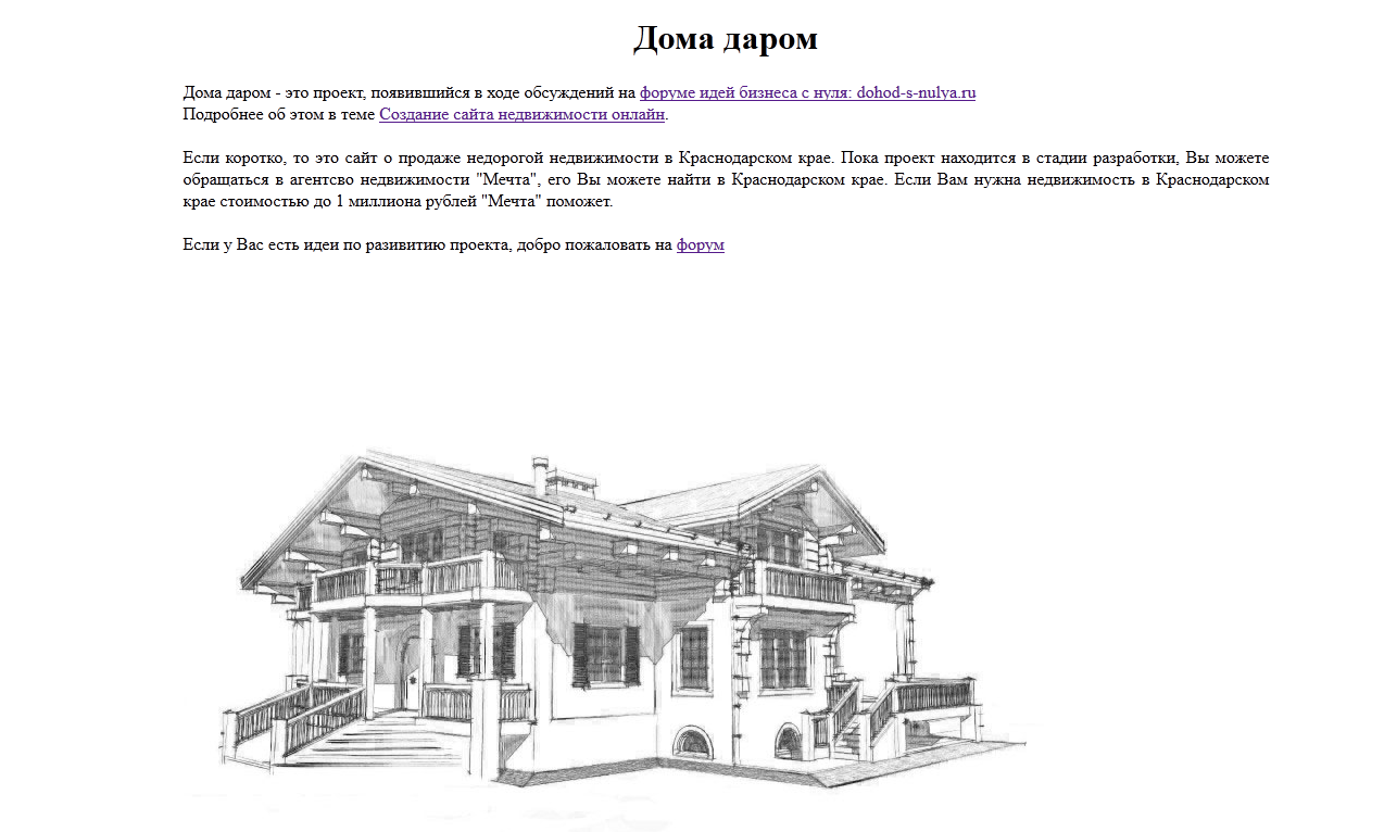 Есть цель создать сайт недвижимости. Для чего зарегистрирован домен doma-darom.ru. Домен был выбран в теме: конкурс № 1.