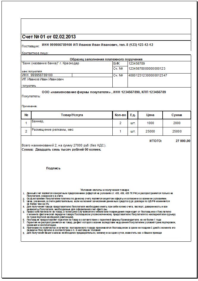 В примере мы не являемся плательщиками НДС, поэтому добавлен текст "Без НДС". Довольно важный момент, потому что плательщик по незнанию может указать НДС.