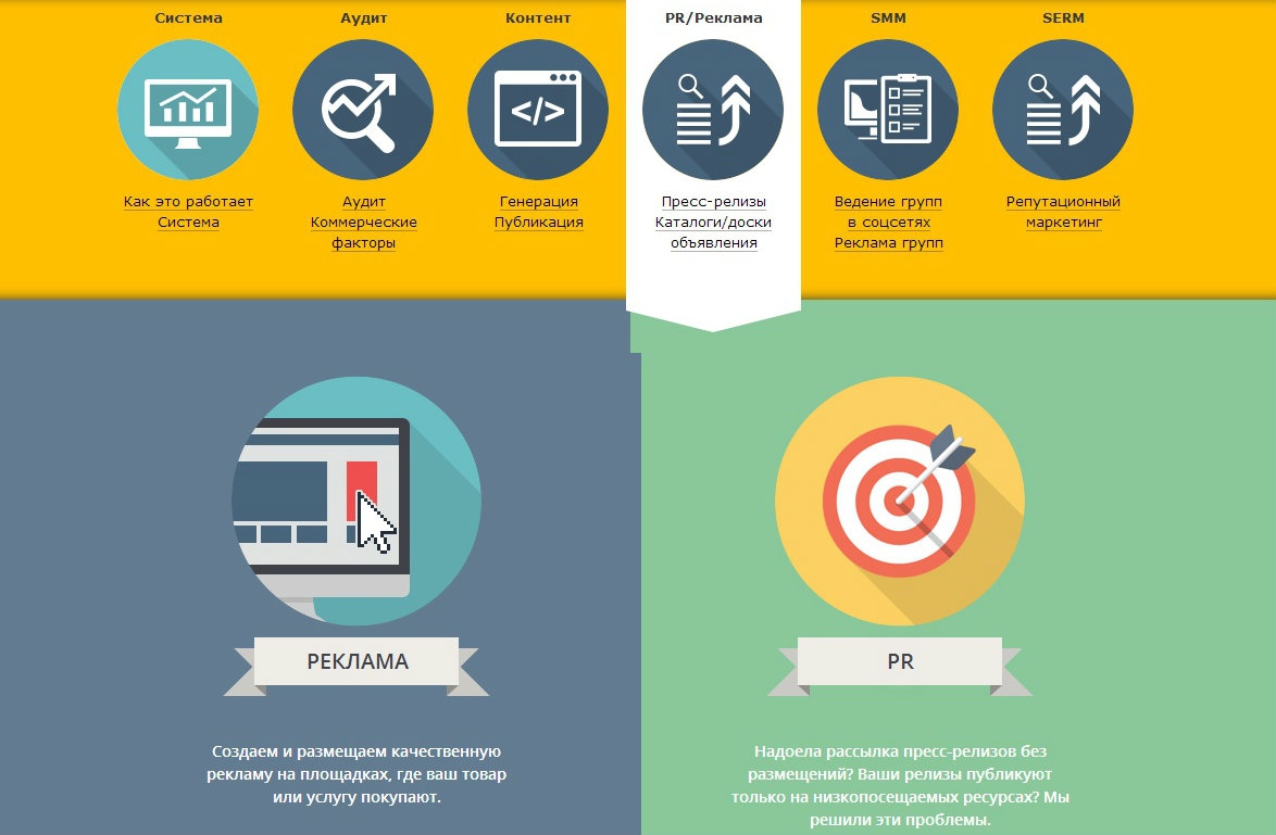 За основу аудита мы взяли вопросы асессоров (сотрудники, которые вручную проверяют качество сайтов в результатах поиска) “Яндекса” и Google. Использование фрилансеров для ответа на эти вопросы, позволило снизить стоимость аудита до 800 (за один сайт и за сравнение с конкурентами в зависимости от количества конкурентов до 5000 руб.). На сервисе предлагаем такие услуги как: распространение информации о Вас в СМИ (рассылка пресс-релизов), размещение рекламы на досках объявлений, ведение групп в социальных сетях без Вашего участия (вы передаете данные о группе системе, устанавливаете количество постов и их стилистику, а система уже отвечает за сохранность ваших личных данных).