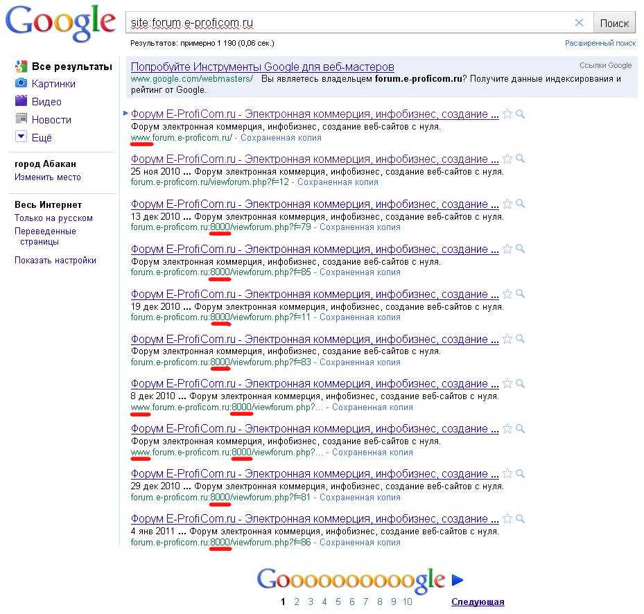 robots.txt - был установлен не с самого начала запуска форума. Страницы с "www" попали в индекс до установки robots.txt и теперь там находятся. С "8000" - был период, когда в адресной строке внезапно стал высвечиваться номер порта "8000". Высвечивался он не сразу, а после некоторых блужданий по разделам форума. Вопрос с "8000" удалось решить (Админпанель - Настройка сервера - "Принудительные настройки URL сервера" - установить "Да". Проверить установки порта - должно стоять 80. Очистить кэш CMS). Предполагаю - Google проиндексировал страницы в тот момент, когда вопрос с "8000" еще не был решен.