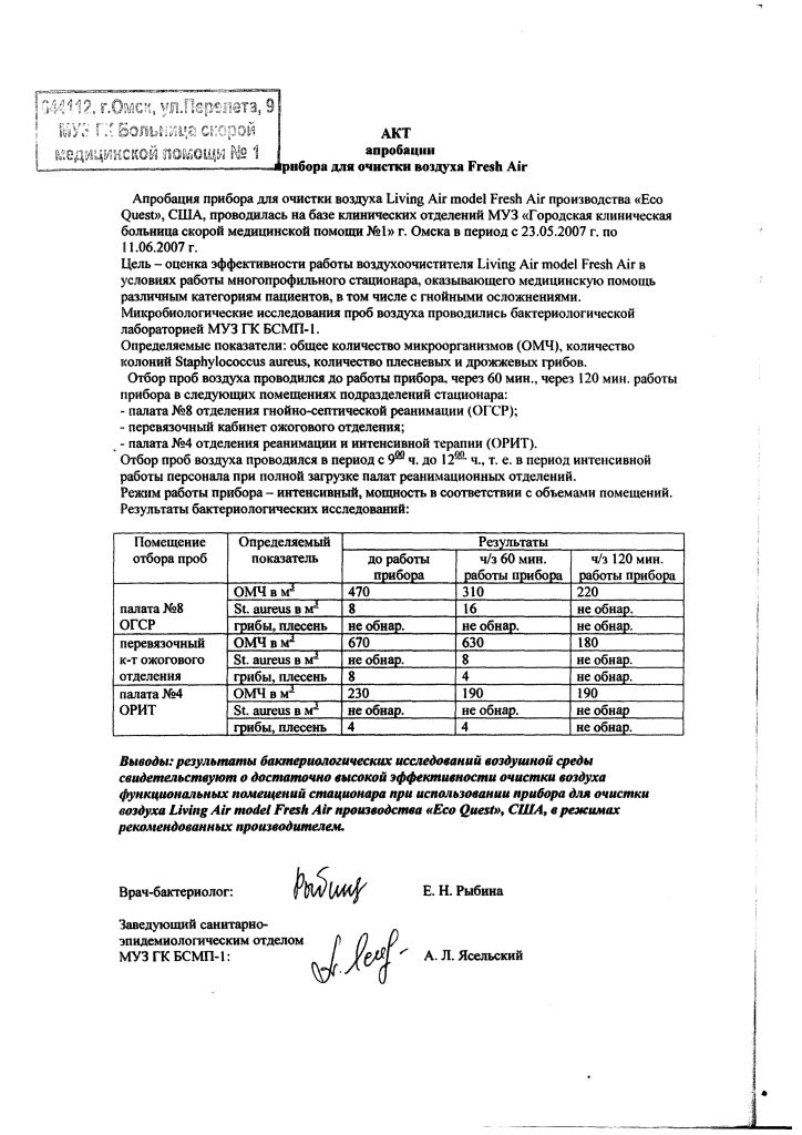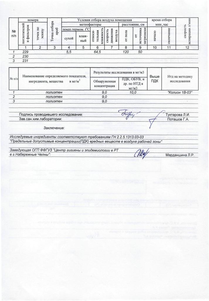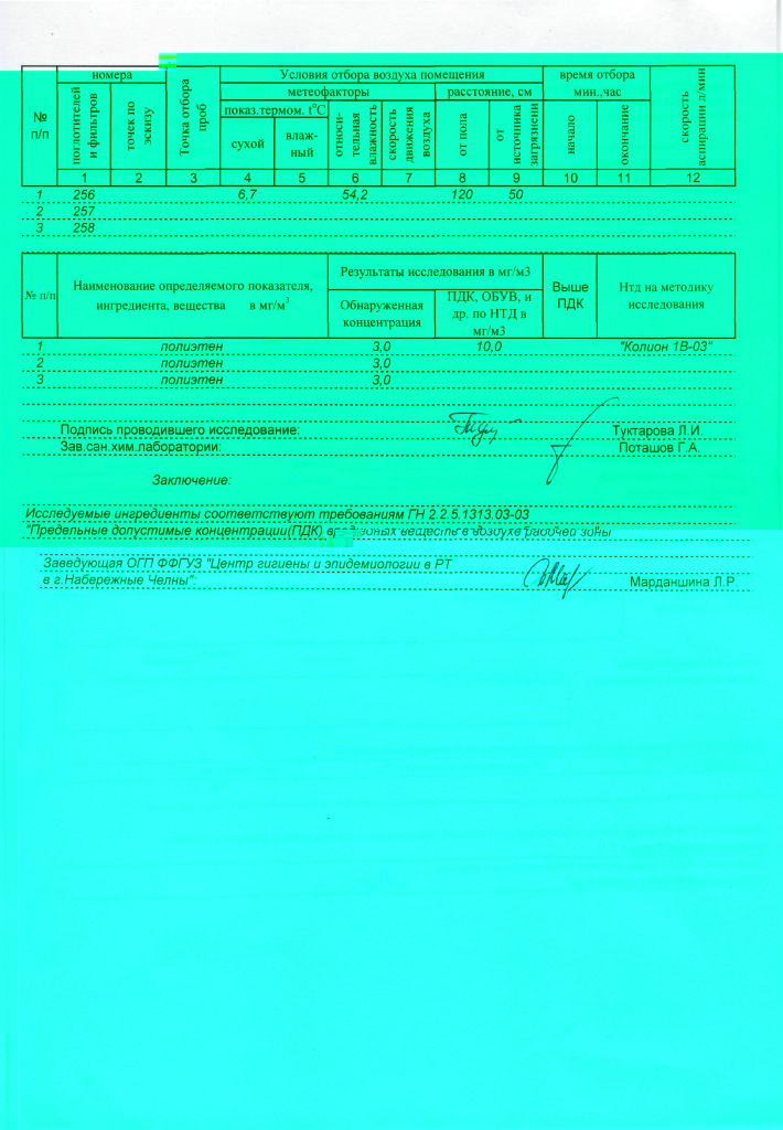 И последнее, для подтверждения работоспособности оборудования, проводятся анализы проб воздуха до работы приборов и после, ФГУЗ "Федеральный центр гигиены и эпидемиологии" Роспотребнадзора по месту нахождения заказчика. Так же клиентами являются не только предприятия которые проводят аттестацию рабочих мест, а она проводится не менее одного раза в пять лет, но и предприятия общественного питания, стоматологии, парикмахерские и другие, которые проверяются до одного раза в год и от проверки к проверки оборудование себя показывает как одна из лучших возможностей очистить не только воздух, но и поверхности в обрабатываемом помещении и это очень важно!