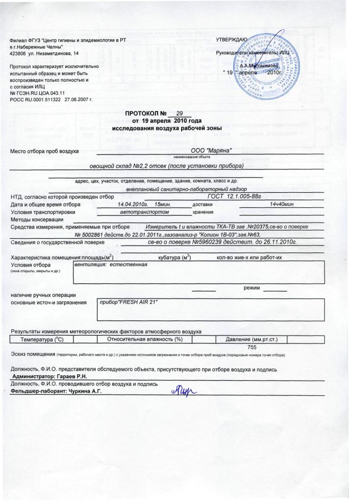 Для владельцев овощехранилищ будет интересна информация о том, что данное оборудование расщепляет газ который выделяется при хранении овощей и фруктов. Испытания проводились в овощехранилище в г.Набережные Челны в Апреле 2010 года.